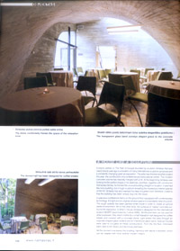 p.7-8 at left above: The small conference hall has been separated from the relaxation zone by a sliding glass partition wall at left below: An Artist's House by G.Karosas is exhibited in the small hall at right: A contrasting aesthetics of rough concrete and smooth glass and metal dominates on the first level of the building